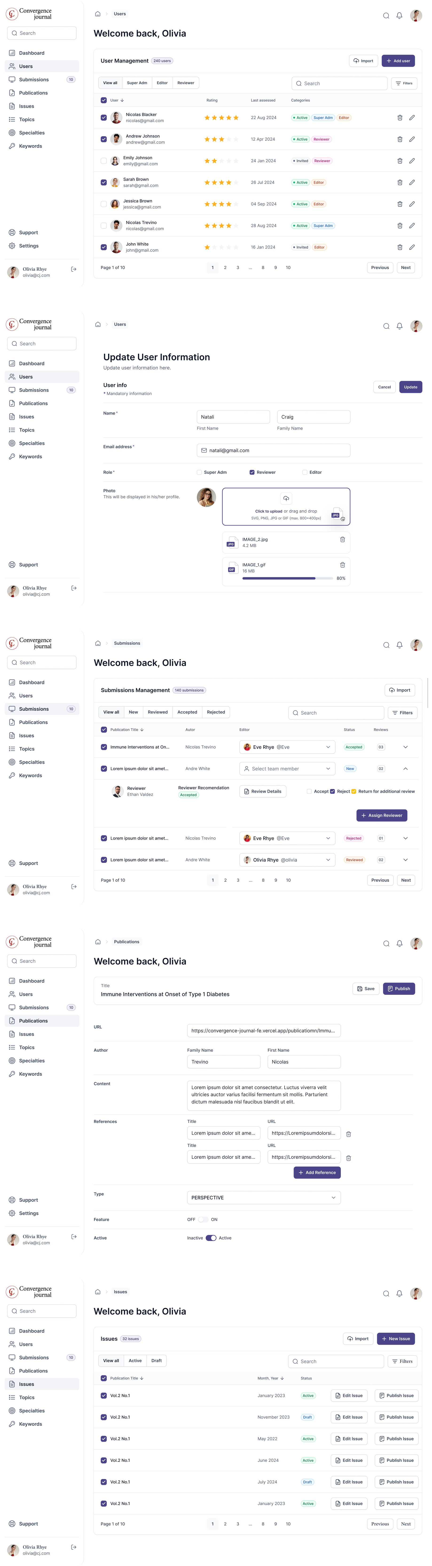 I developed a CRM system designed to centralize scholar and contributor data, manage manuscript submissions and reviews, and facilitate communication between editorial teams and external collaborators. The platform includes tools for streamlining peer review workflows and managing engagement with the journal’s audience. The interface is clean, intuitive, and easy to navigate, ensuring accessibility for both internal teams and external users, while offering customizable options to meet the specific needs of the academic publishing process